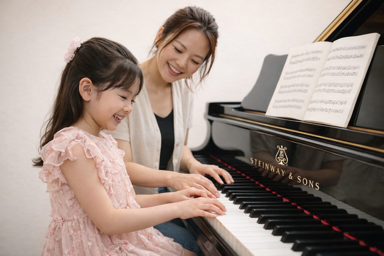 スタインウェイ、ベヒシュタイン 常設。本物の響きに包まれて学ぶことで、音を聴く力、美しい音を感じる取る耳を育てます。