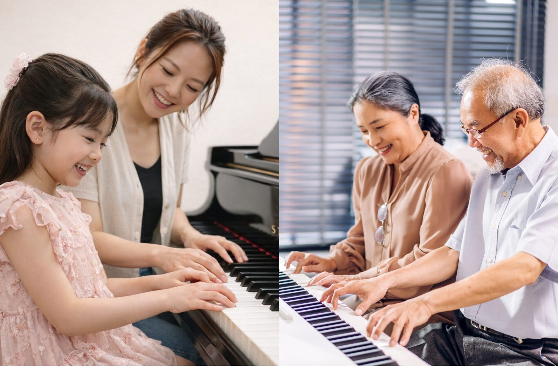 どちらのコースも完全マンツーマンレッスン。趣味のピアノからコンクールや受験指導まで可能です。子供から大人まで、厳しい選抜基準をクリアした一流の講師陣が指導いたします。