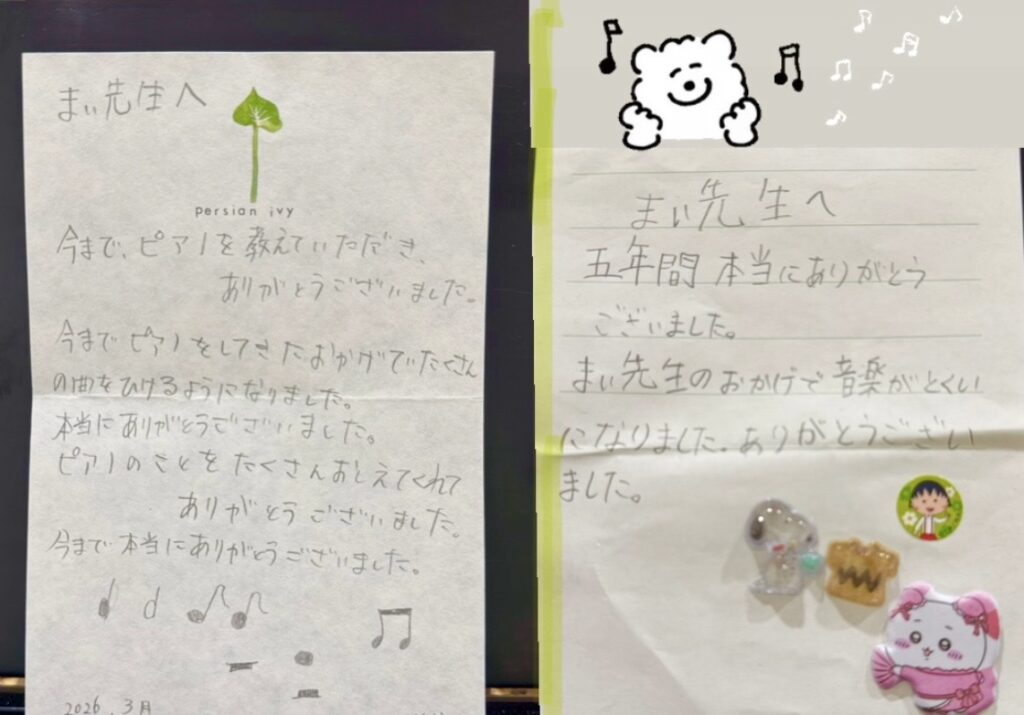 今年度のレッスンも終了いたしました!3月末のレッスンが最後だった小学校高学年の生徒からは、「先生〜!ありがとうございました!」と手紙のプレゼントをいただきました。( ʚ̴̶̷́ .̠ ʚ̴̶̷̥̀ )