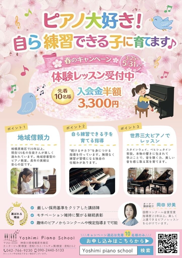 相模原市南区Yoshmi Piano School (旧Yoshimiピアノ教室)講師の茅原田真衣です。